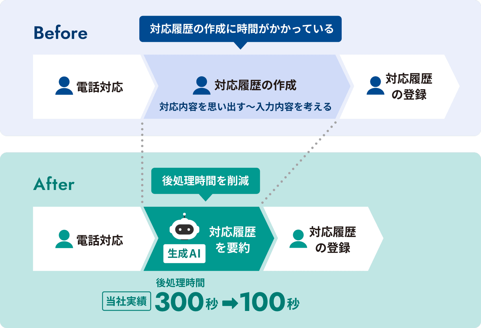 音声認識によるテキスト化と生成AIによる対応履歴の要約により、後処理業務を効率化します。