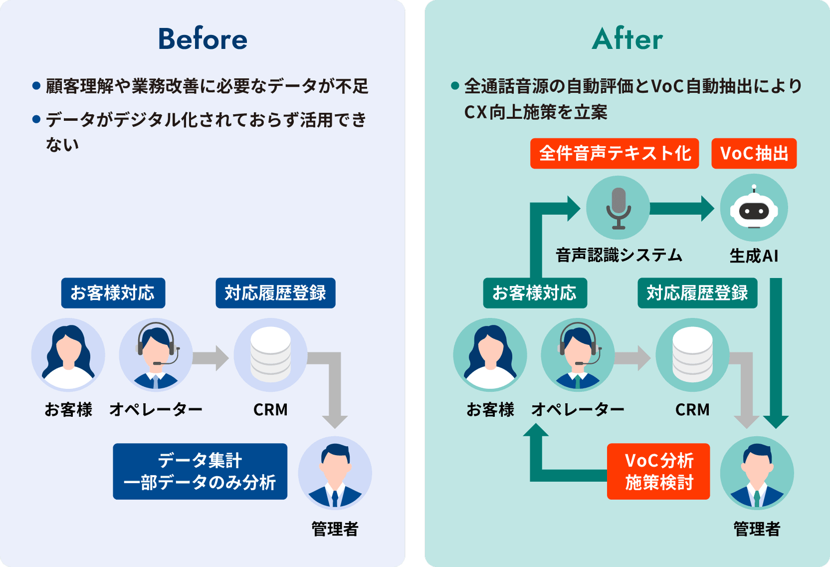 お客様対応した全通話音源の自動評価とコンタクトリーズンをはじめとするVoCの自動抽出により、CX向上施策を立案します。