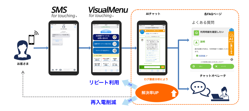 - スマートフォン利用のお客さまが多いことに着眼し、サポートナビゲーションを集約する「BIGLOBEサポートナビ」を立ち上げ。ビジュアルIVRによるチャネル誘導、AIチャット、有人チャットサポートを開始