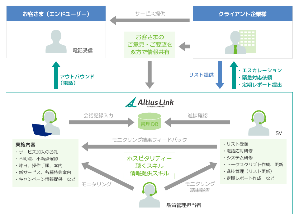 通信サービス申込みへのお礼と利用促進を兼ねて、利用開始直後のお客さまへサンキューコールを実施しました。お客さまとの接点を増やし、不明点・不満点や要望をいち早くキャッチする仕組みを構築しました。- アルティウスリンクはKDDIエボルバとりらいあコミュニケーションズが経営統合した会社です。