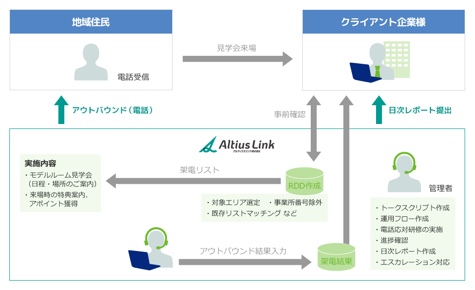 モデルルームのオープンにあたり、見学会への来場促進のご案内電話を住宅メーカー様に代わって実施することで、見学会への来場率の向上に貢献しました。- アルティウスリンクはKDDIエボルバとりらいあコミュニケーションズが経営統合した会社です。