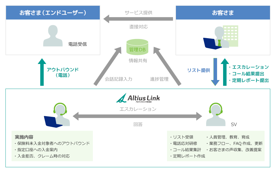 電話にて入金方法のご案内をすることで、入金忘れや未入金リスクを事前に低減させることに貢献しました。- アルティウスリンクはKDDIエボルバとりらいあコミュニケーションズが経営統合した会社です。