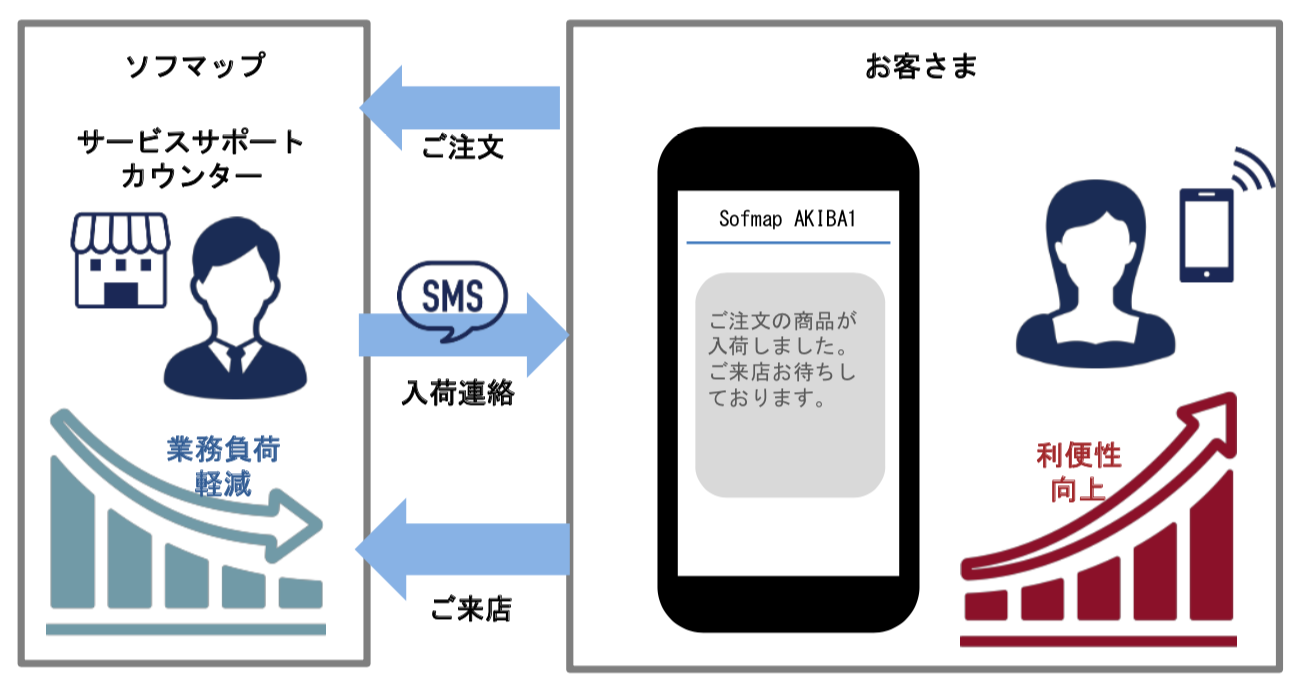 お客様の利便性を徹底的に追及し、注文商品の入荷連絡等をSMSで実施。サービスサポートスタッフの工数大幅削減にも成功。