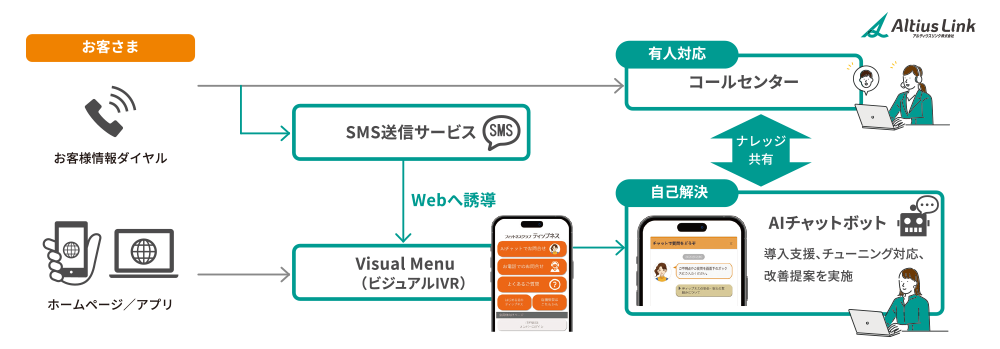 電話からWebへ誘導可能なSMS送信サービスと、問合せ・自己解決チャネルの選択肢を可視化できるビジュアルIVRを導入。AIチャットボットによる自動問合せ対応も開始し、お客さまの利便性を向上。アルティウスリンク株式会社と共に、店舗がコア業務に注力できる仕組み作りに邁進