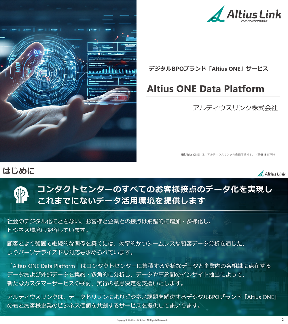 Altius ONE Data Platformは顧客接点を中心に企業内外のデータを掛け合わせて顧客インサイトを分析・可視化するコンタクトセンター起点のデータ活用プラットフォームサービスです。