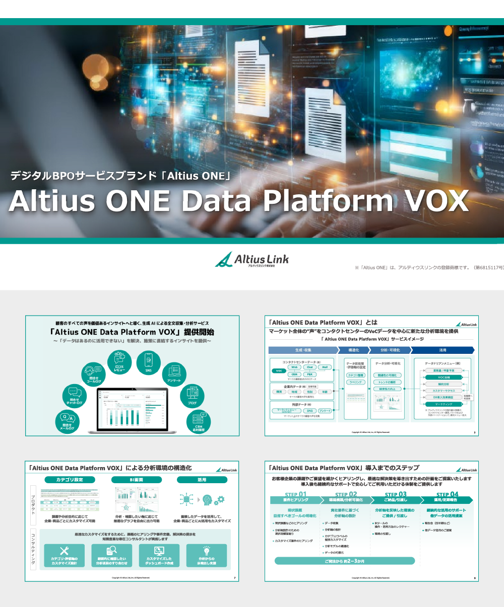 コンタクトセンターやマーケットレビューなどの顧客の声、アンケートなど、さまざまなテキストデータを幅広く収集・構造化、施策分析や商品改善に役立つ示唆を新たな分析環境で意思決定を支援するデータ活用サービスです。