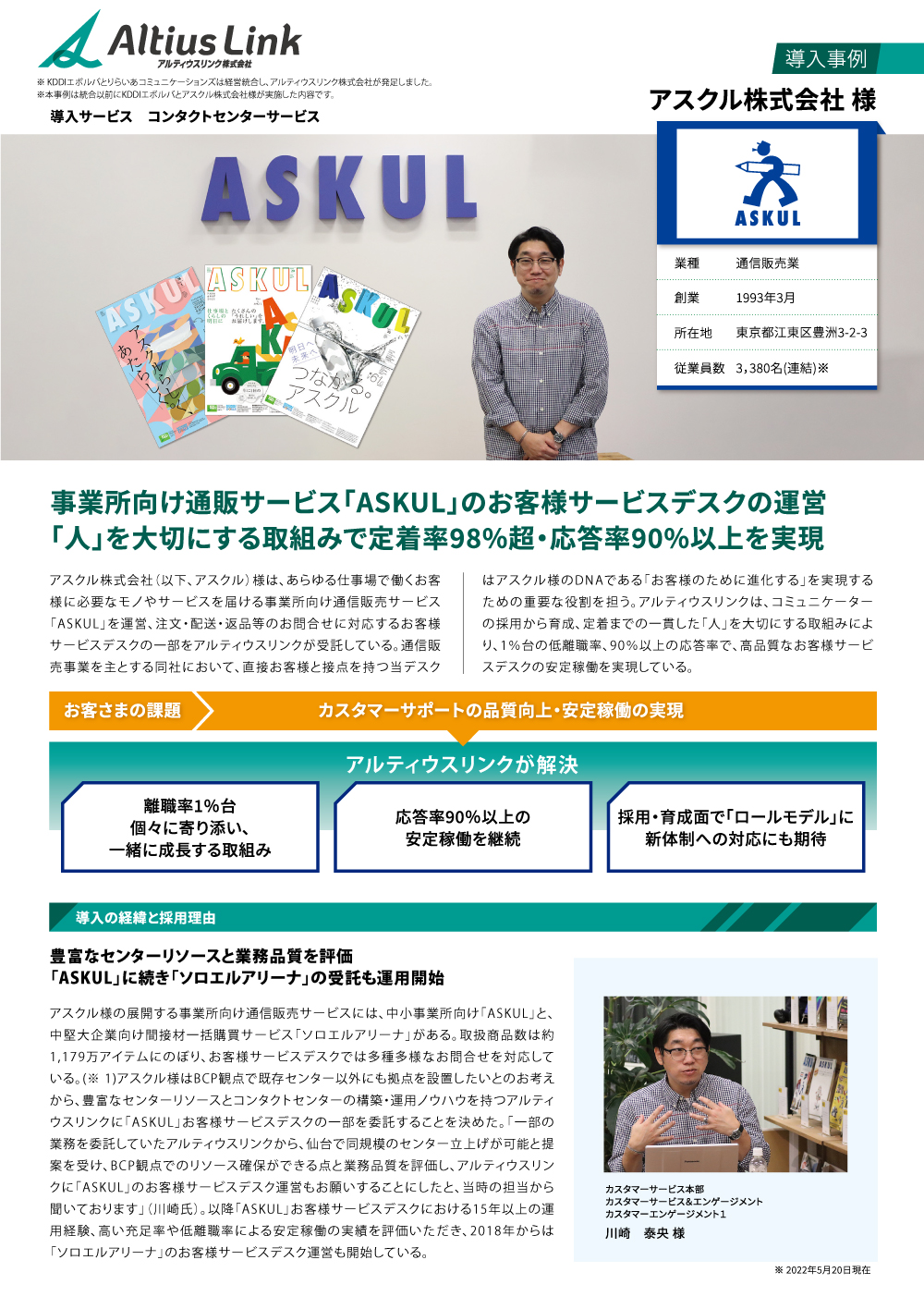 課題:カスタマーサポートの品質向上・安定稼働の実現 事業所向け通販サービス「ASKUL」のお客様サービスデスクの運営 「人」を大切にする取組みで定着率98%超・応答率90%以上を実現