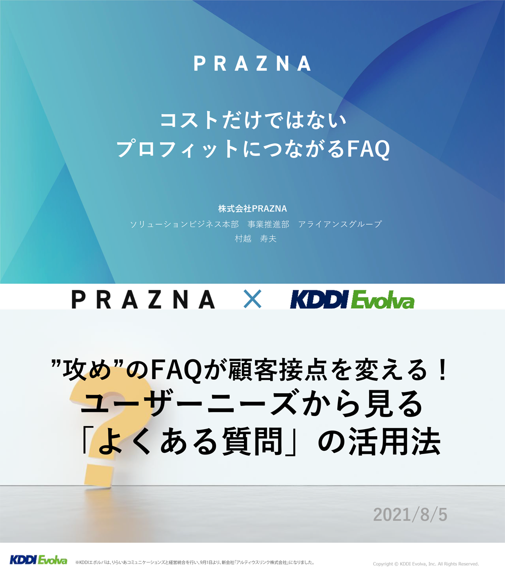 本セミナーでは、10年連続国内シェアNo.1の「FAQシステム」を提供するPRAZNA社と、コンタクトセンター運用を手掛けるKDDIエボルバが、FAQを最大限に生かしたサポートのポイントについてお話ししました。