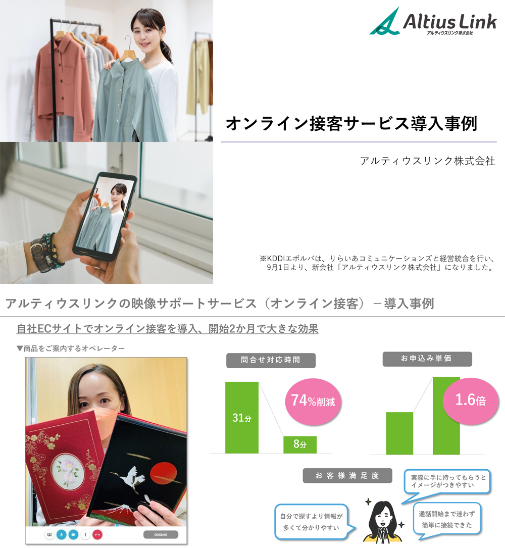 オンライン接客サービスは有人による音声と映像によるサポートで、対面接客の安心感はそのままに離れた場所にいるお客様とのコミュニケーション機会を創出します。 実際に導入し得られた大きな効果や活用事例のご紹介をもとに、導入する際のポイント、アルティウスリンクがご提供する運用構築・開始までのフローなどをご紹介します。