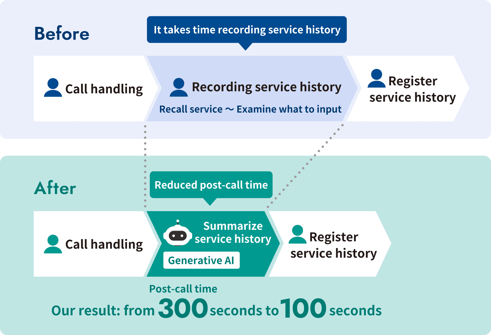 Transcription through voice recognition and summary of service history by generative AI streamline post-call work.