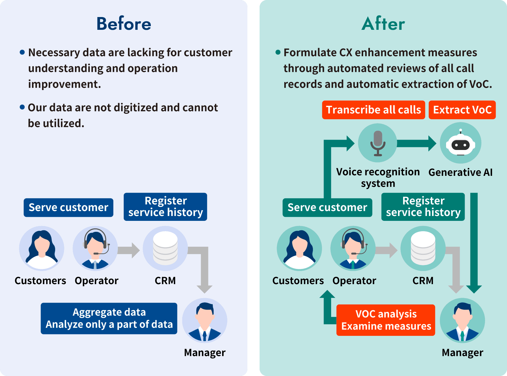 We propose CX enhancement measures through automated reviews of all voice records of customer service calls and the automatic extraction of contact reasons and other VoC.