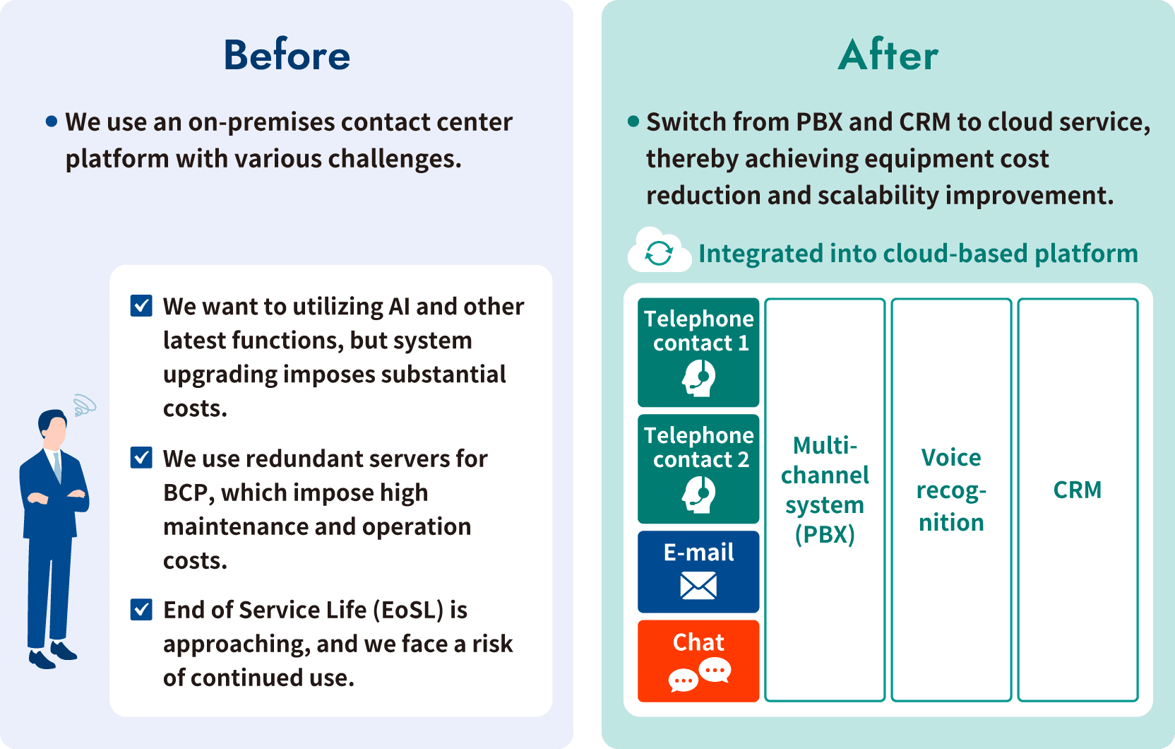 Switch from PBX and CRM to cloud service, thereby achieving equipment cost reduction and scalability improvement