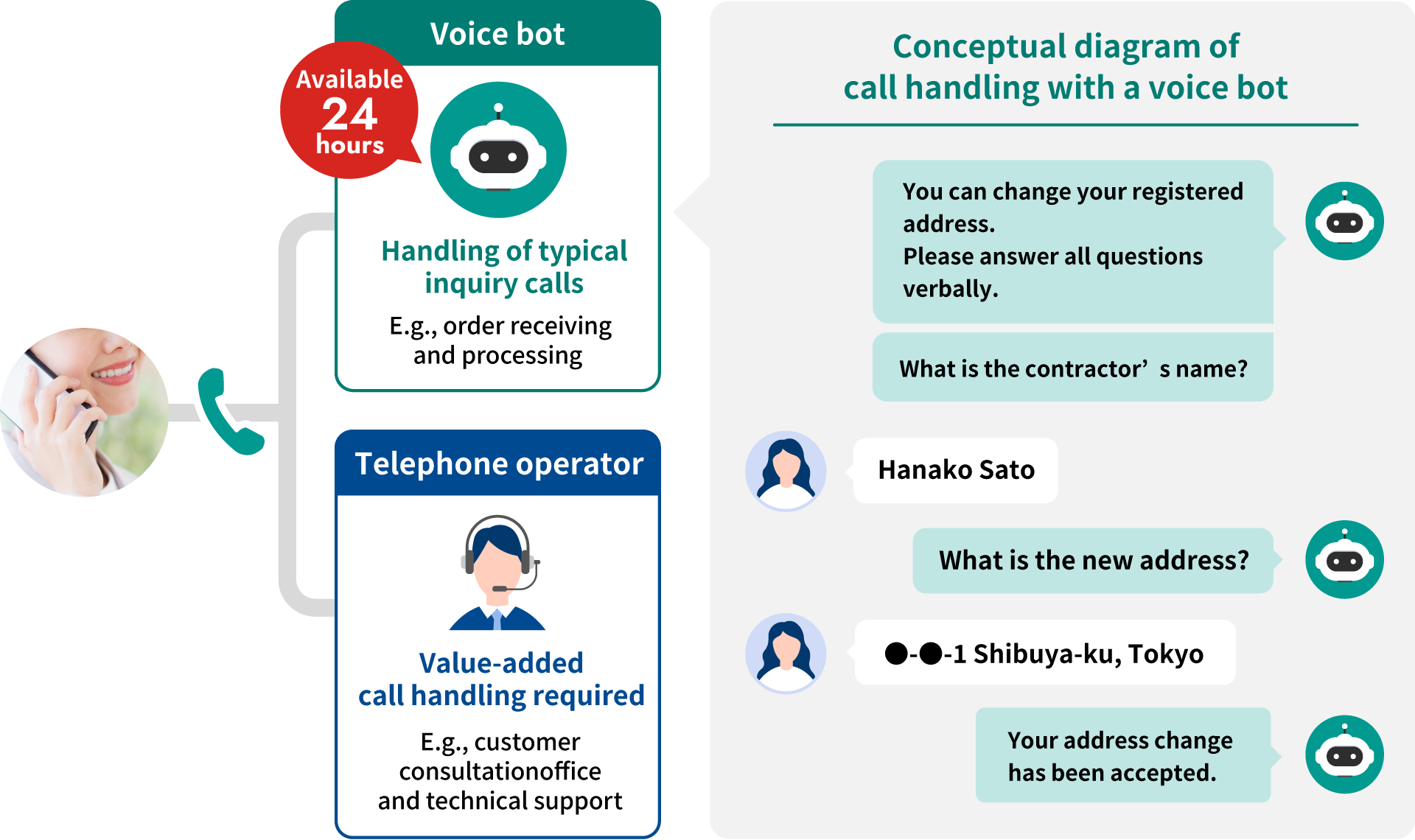 We provide a one-stop service from voice bot introduction to operation, which automates call handling with voice recognition technology and AI.
