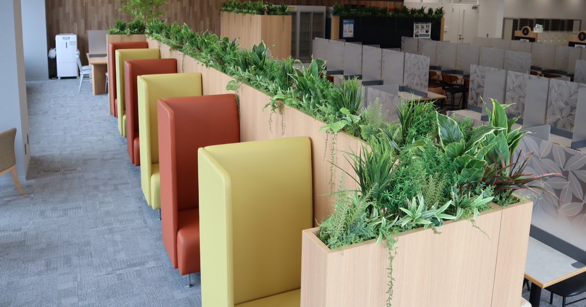 仙台宮城野ビルでは、マルシェをイメージした150人規模のおしゃれなリフレッシュエリアで